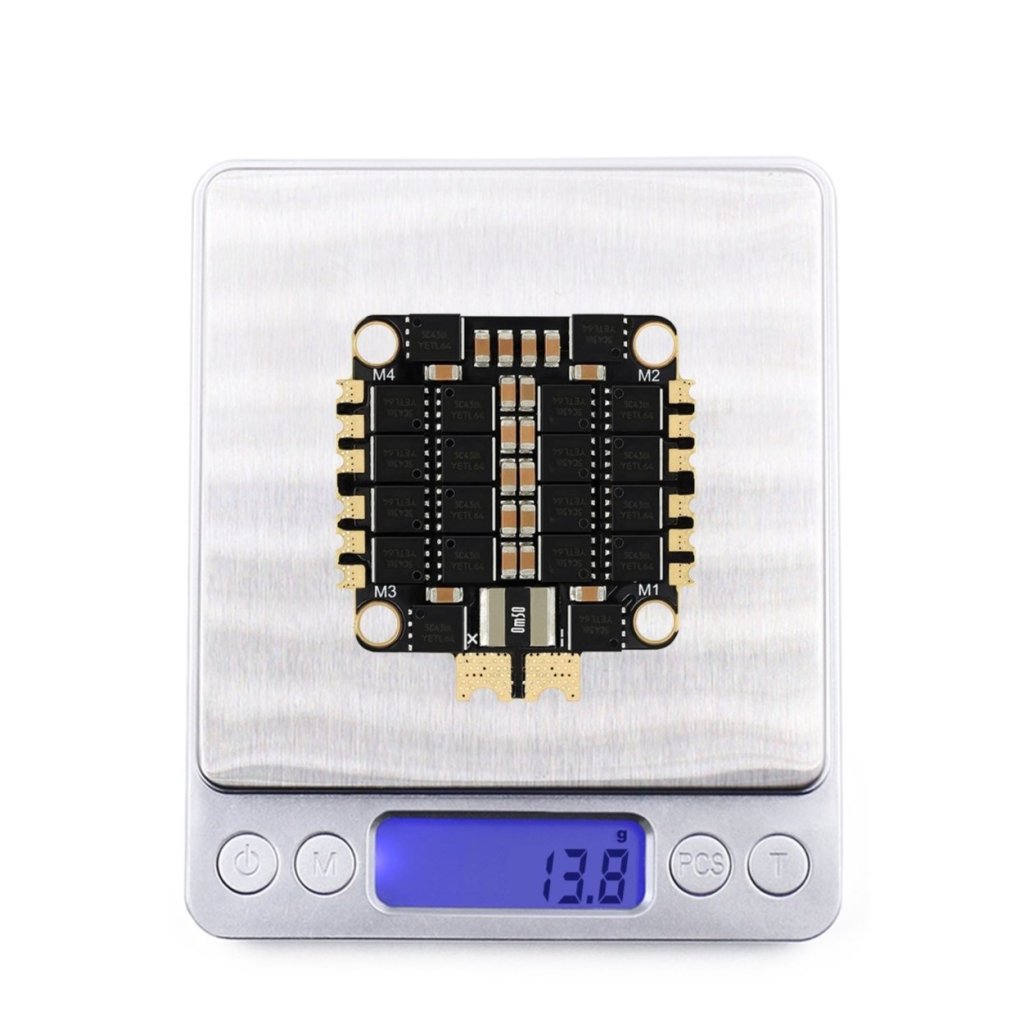 - Regulátor podporuje vstupní napětí 3-6S, protokol Dshot600 a až 65A krátkodobý odběr na každý motor