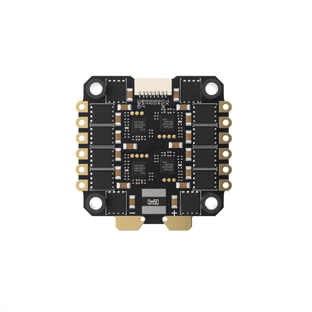 Regulátory zvládají proud až 50A, používají firmware BlHeli_32 a mají integrovaný senzor proudu.