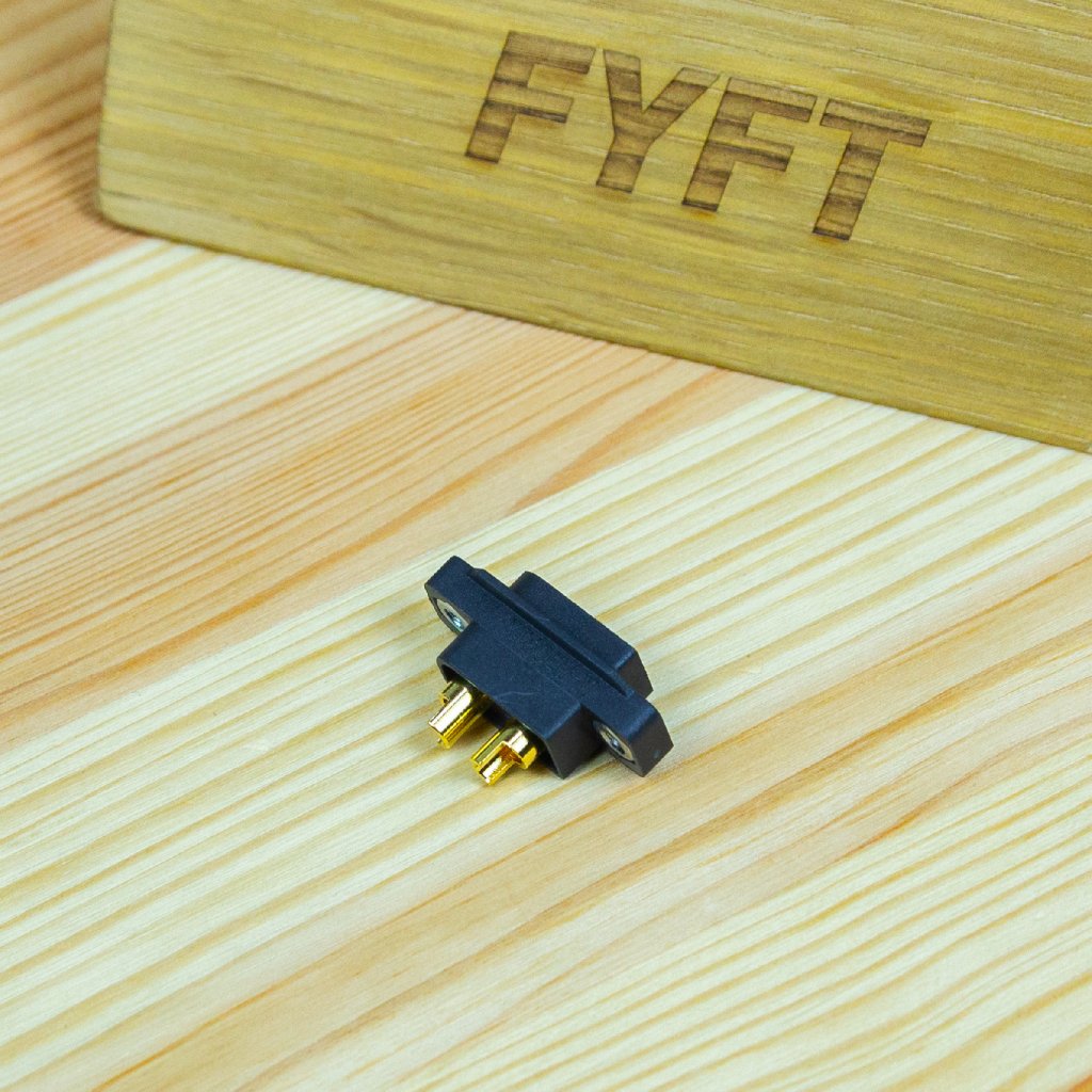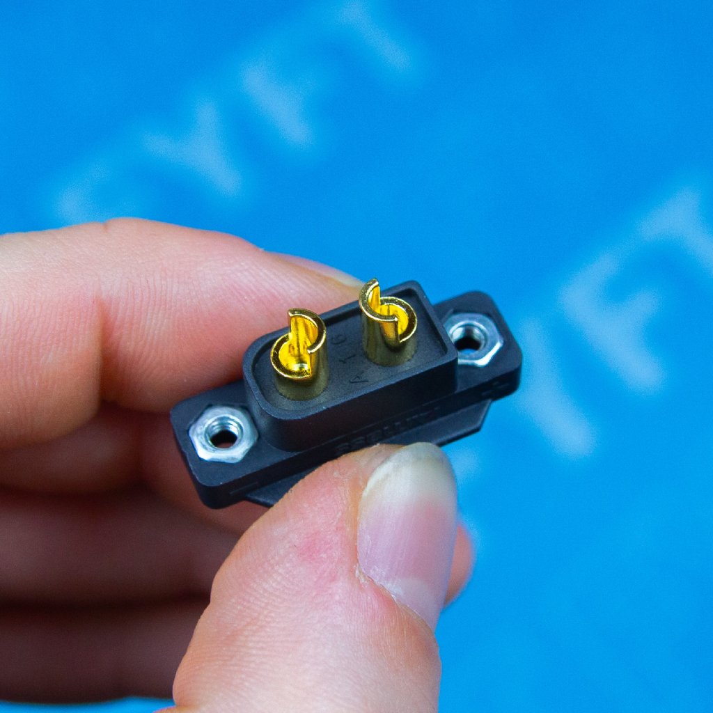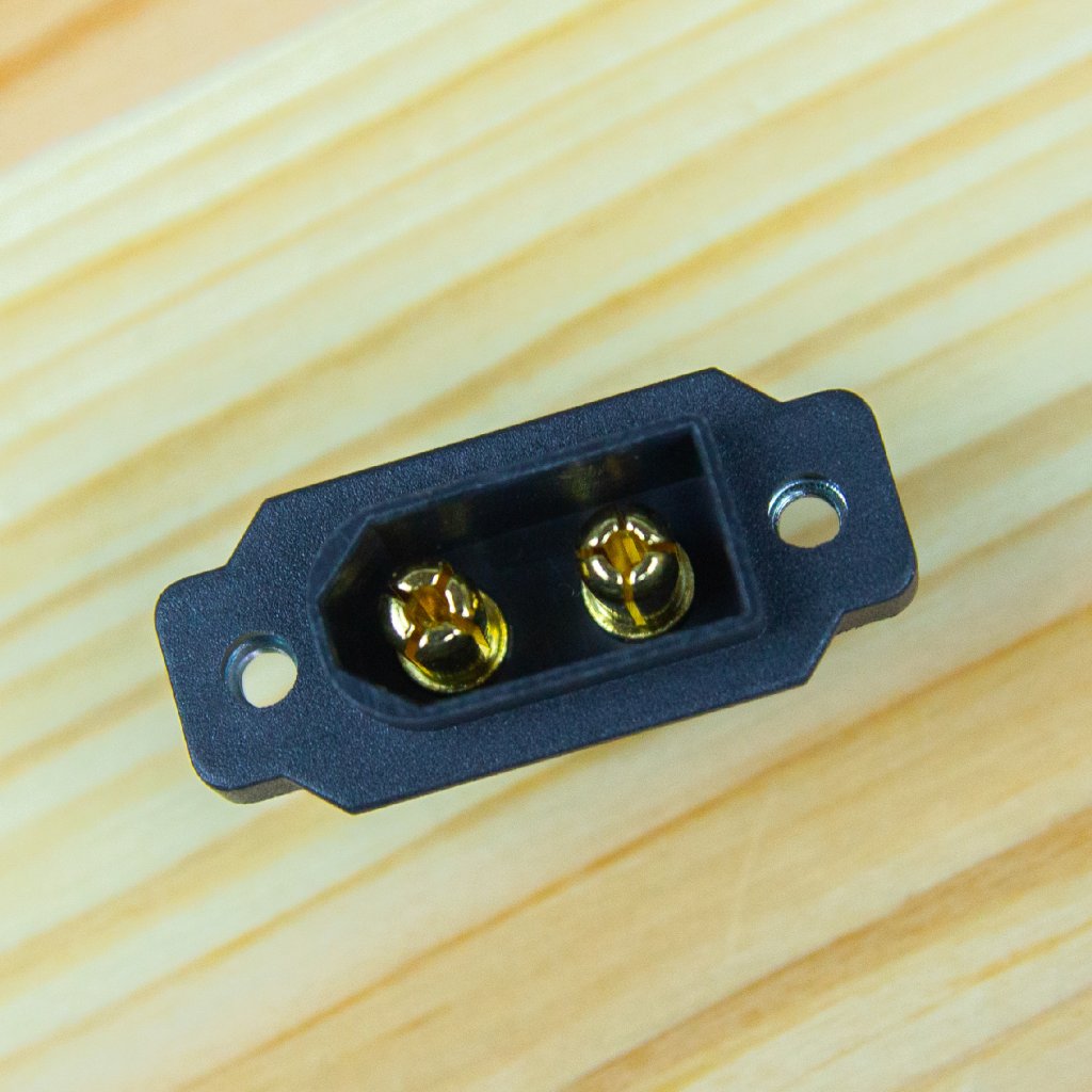 - Dvoukolíkový silový konektor se 3,5 mm zlacenými kontakty se zatížitelností max. 60 A. Pro kabely o průřezu max. 3,3 mm2 (12AWG). Přechodový odpor 0,55 mOhm, max. 500V.