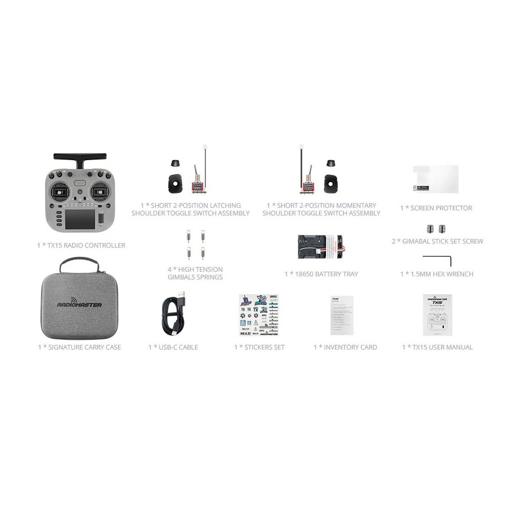 - Radiomaster TX15 je kompaktní vysílačka vhodná pro začátečníky i zkušené piloty.