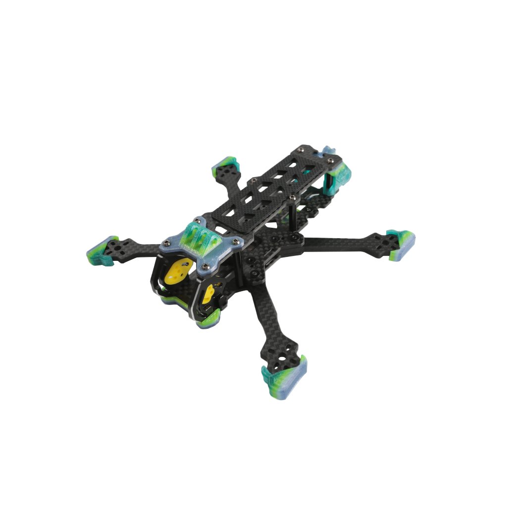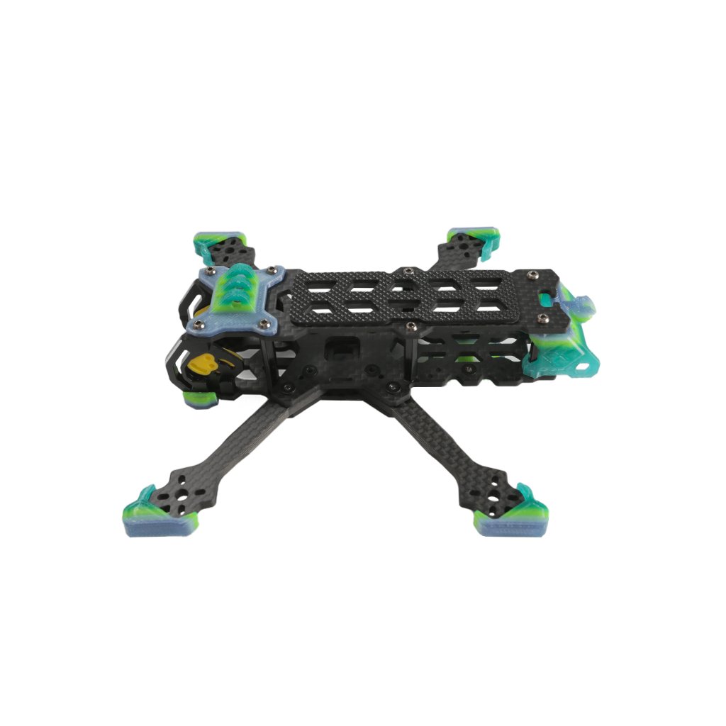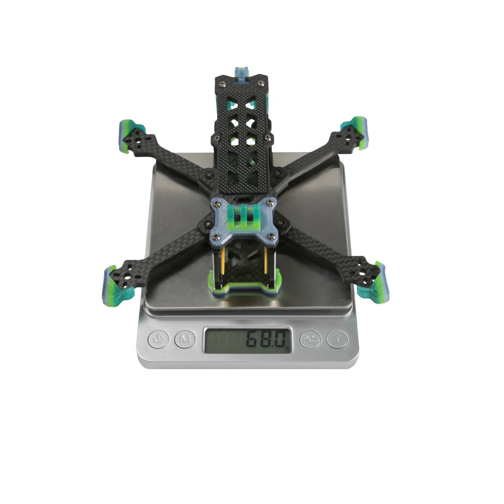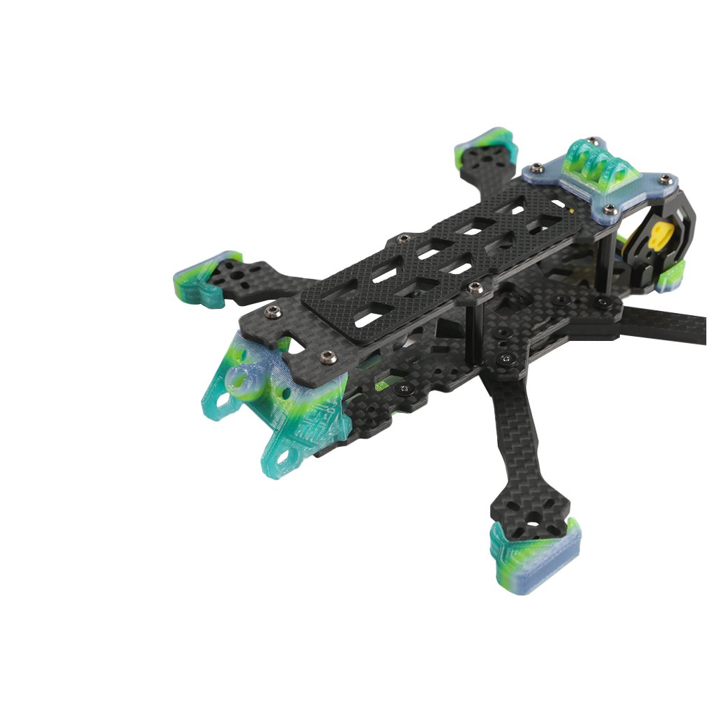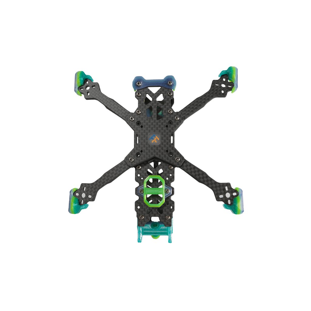 - Rám má M3 montážní díry pro stacky 20x20mm a 25,5x25,5mm. V zadní části rámu je místo pro druhý stack. Montážní díry jsou 20x20mm a 25,5x25,5mm M2. Do rámu lze tak umístit analogový přenos i Caddx Vista, Walksnail Avatar nebo DJI O3.